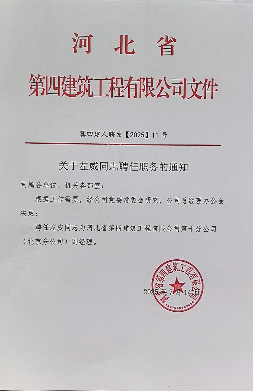 关于左威同志聘任职务的通知